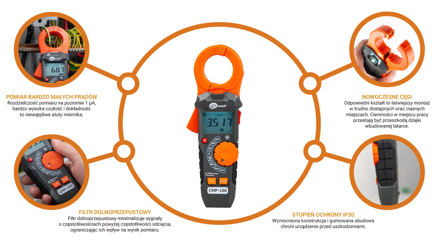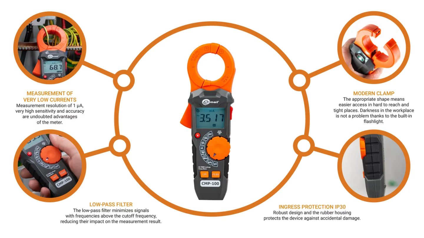 El Sonel CMP-100 mide corrientes muy pequeñas. Resolución de medición de 1 μA, sensibilidad y precisión muy altas son los puntos fuertes indudables del medidor. El filtro de paso bajo minimiza las señales con frecuencias superiores a la frecuencia de corte, limitando su influencia en el resultado de la medición. La oscuridad en el lugar de trabajo no es un problema gracias a la linterna incorporada.